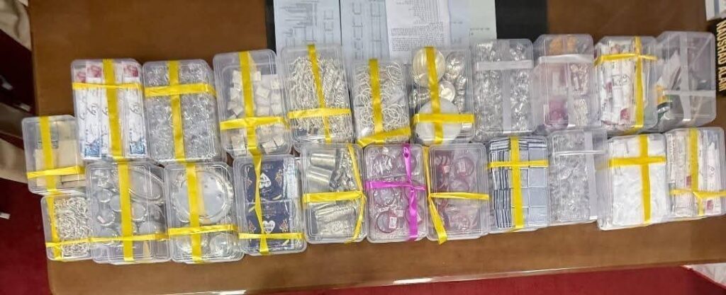 चाँदी जैसे पदार्थ 560 अद्द बिछिया,चाँदी जैसा पदार्थ का 162 जोड़ा पायल,चाँदी जैसा पदार्थ का छोटा-बड़ा 27 अद्द गलास चाँदी जैसा पदार्थ का छोटा-बड़ा 46 अद्द चम्मच, चाँदी जैसा पदार्थ का इत्र छिटने वाला 01 अद्द,चाँदी जैसा पदार्थ का चिराग दिया मोर बना हुआ 01 अद्द,चाँदी जैसा पदार्थ का छोटा-बड़ा कटोरा 90 अद्द,चाँदी जैसा पदार्थ का पूजा का 01 अद्द थाल, चाँदी जैसा पदार्थ का अलग-अलग साईज का नग लगा हुआ 74 अद्द चाभी रिंग, चाँदी जैसा पदार्थ का अलग-अलग साईज का 115 अद्द ब्रेसलेट,चाँदी जैसा पदार्थ का अलग-अलग साईज का 146 बेरा,चाँदी जैसा पदार्थ का अलग-अलग साईज का 08 अद्द लोटनी,