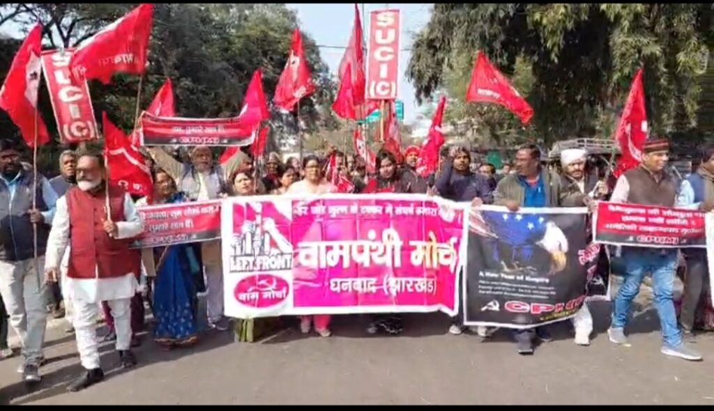 धनबाद : जिला मुख्यालय स्थित रणधीर वर्मा चौक पर वामपंथी संगठनों ने वेनेजुएला के राष्ट्रपति को बंधक बनाए जाने के विरोध में और अमेरिकी राष्ट्रपति डोनाल्ड ट्रंप की कथित तानाशाही नीतियों के खिलाफ एक दिवसीय प्रदर्शन किया। प्रदर्शनकारियों ने आक्रोश मार्च निकाला और अमेरिकी राष्ट्रपति का पुतला दहन किया।