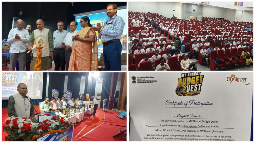 धनबाद: दिनांक 13-04-2026 को रिम्स, रांची के सभागार में “मेरा युवा भारत, झारखंड” जो युवा कार्यक्रम एवं खेल मंत्रालय, भारत सरकार द्वारा आयोजित “माई भारत बजट क्वेस्ट 2026” के अंतर्गत दो दिवसीय राष्ट्रीय युवा संवाद कार्यक्रम के द्वितीय दिवस का विधिवत उद्घाटन रांची के विधायक श्री सी पी सिंह द्वारा किया गया।
